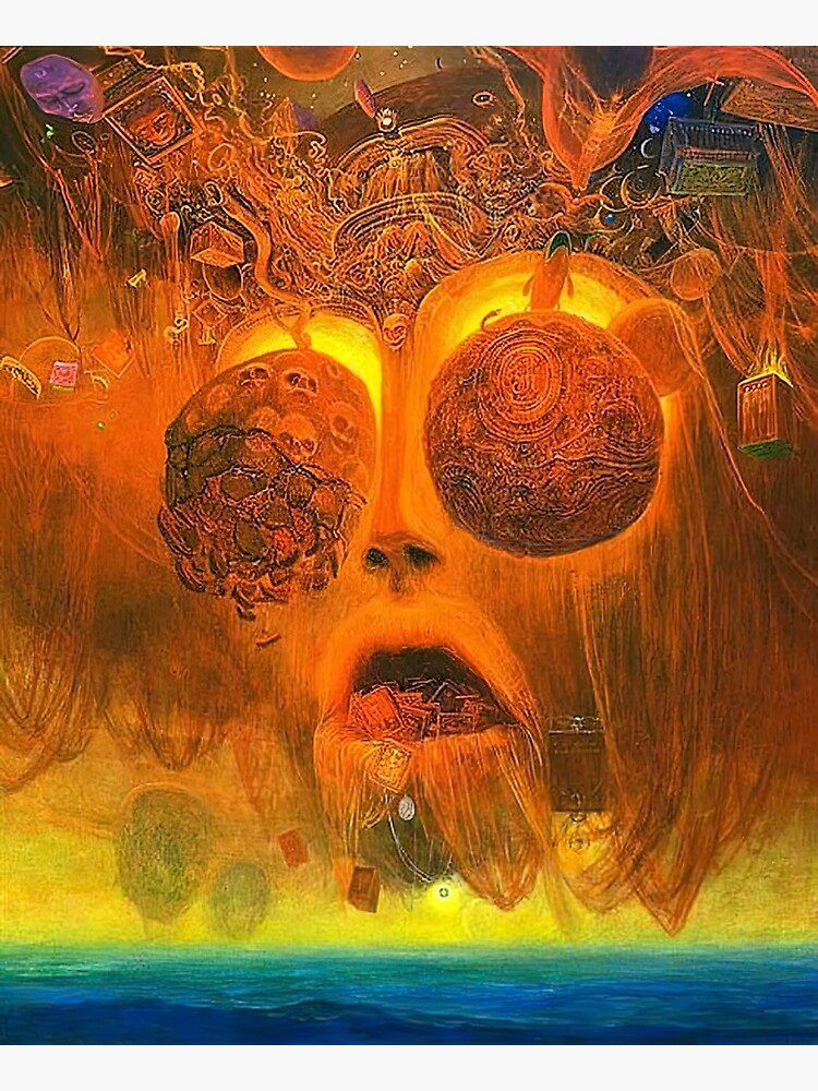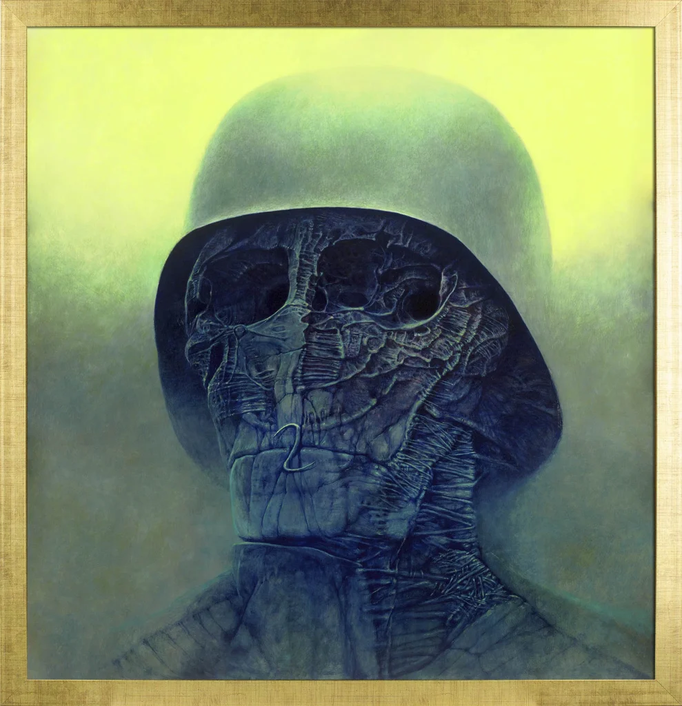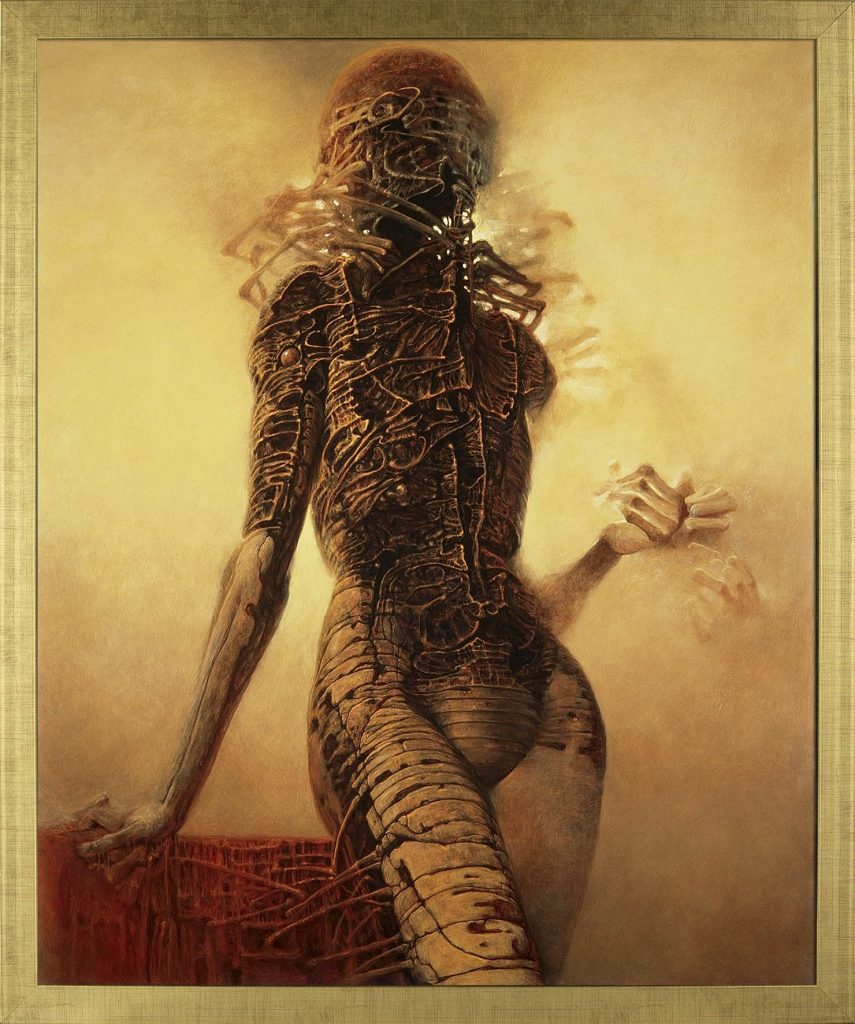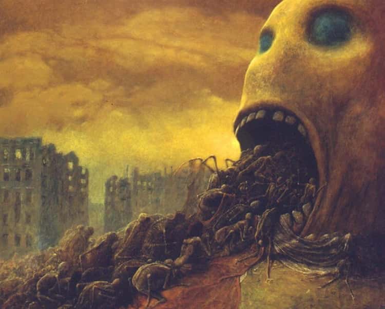في هذا القسم، نبتعد قليلاً عن الكلاسيكيات لنلقي نظرة على أعمال الفنان البولندي زدزيسلاف بيكسينسكي (Zdzisław Beksiński). لوحات بيكسينسكي (التي غالباً ما تكون بلا عنوان) تصور عالماً ديستوبياً مروعاً مليئاً بالهياكل العظمية، والمباني القوطية المدمرة، والأجساد المشوهة. يصف بيكسينسكي أسلوبه بأنه “تصوير للأحلام”، لكنها أحلام تبدو وكأنها التقطت من قلب الجحيم، مما يجعل أعماله بلا شك من أكثر اللوحات رعباً في العالم في الفن المعاصر.