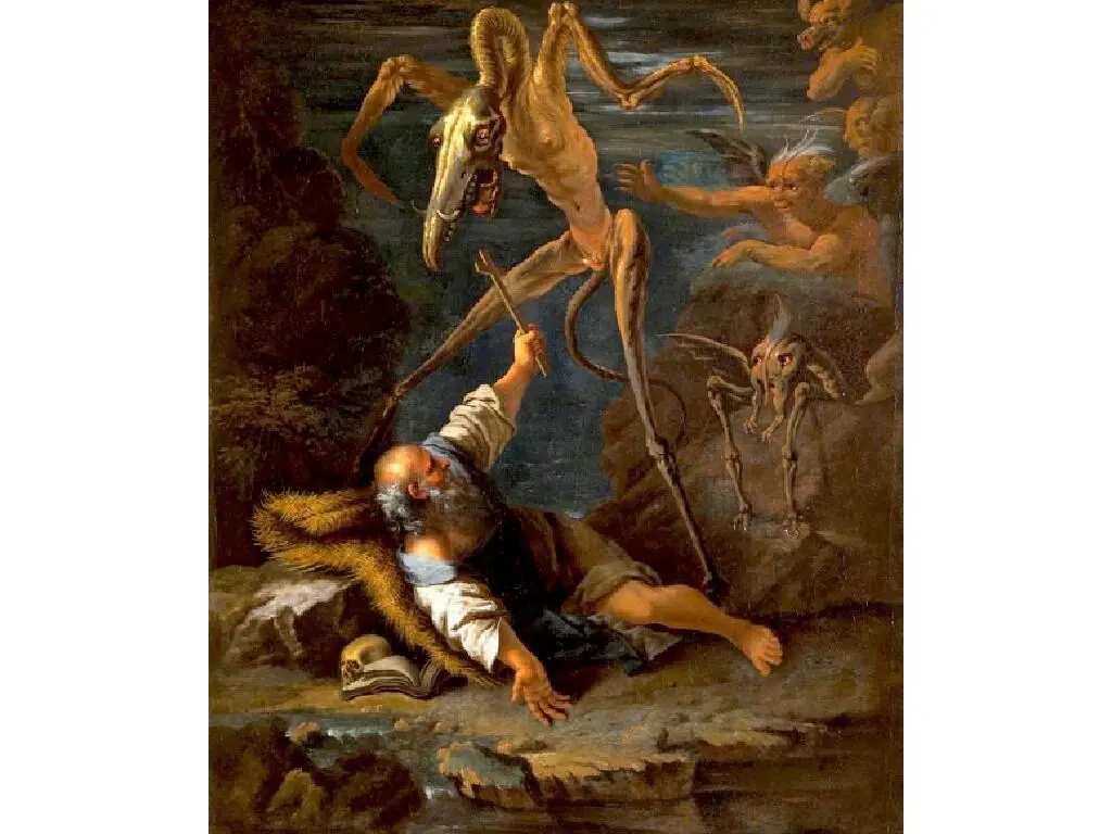 في هذه اللوحة، يواجه القديس أنتوني وحشاً غريباً ومشوهاً في الصحراء، يمثل وسوسة الشيطان. تميز روزا بأسلوبه الذي يميل إلى الغرابة والسريالية قبل ظهور السريالية بقرون، مما جعل أعماله تترك انطباعاً مقلقاً لدى المشاهد.