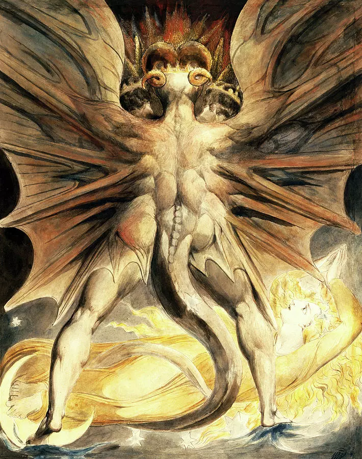 استلهم ويليام بليك، الشاعر والرسام الذي تأثر بالروحانيات، هذه اللوحة من سفر الرؤيا. يظهر فيها التنين الأحمر كتجسيد للشيطان يقف فوق امرأة تلد. ألهمت هذه اللوحة الكاتب توماس هاريس في روايته “التنين الأحمر” (سلسلة هانيبال ليكتر)، مما رسخ مكانتها في ثقافة الرعب.