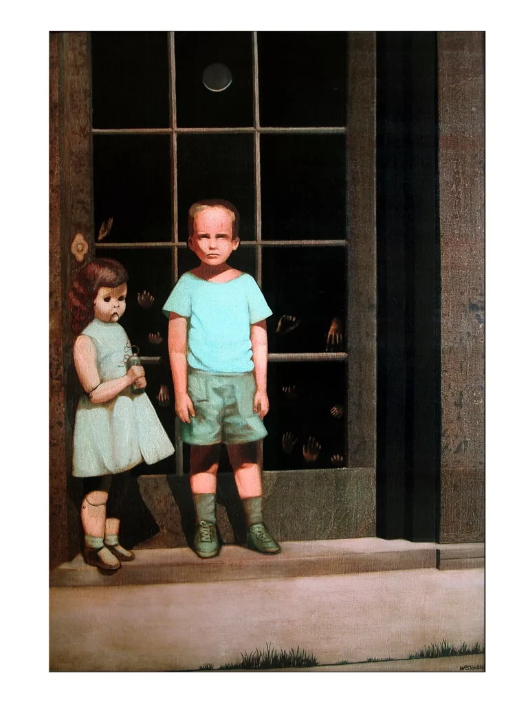 أحياناً تكون القصة خلف اللوحة هي ما يجعلها مرعبة. تصور اللوحة صبياً ودمية بحجم طفل يقفان أمام باب زجاجي تضغط عليه أيادٍ كثيرة من الداخل. اشتهرت اللوحة بأنها “مسكونة” بعد أن ادعى زوجان اشترياها أن الشخصيات تتحرك ليلاً وتخرج من الإطار، مما جعلها واحدة من أكثر اللوحات رعباً في العالم في العصر الحديث.